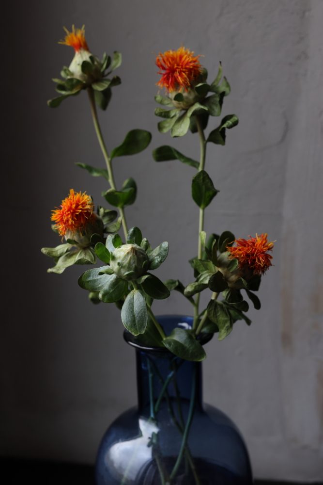 В цветочном магазине купили веточку цветов под названием «Занзибар». Дома посмотрели его истинное название, оказалось, что это сафлор красильный или американский шафран или красильный чертополох. Действительно, похож цветом на шафран, а строением цветка напоминает чертополох. И да, сафлоровое масло делают из такой красоты.
