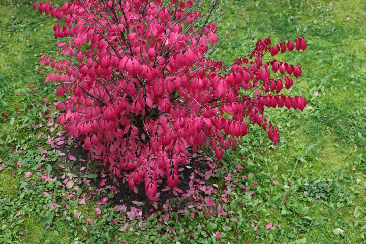 Можно долго любоваться, как яркий бересклет скидывает пурпурные листья на изумрудную траву.
