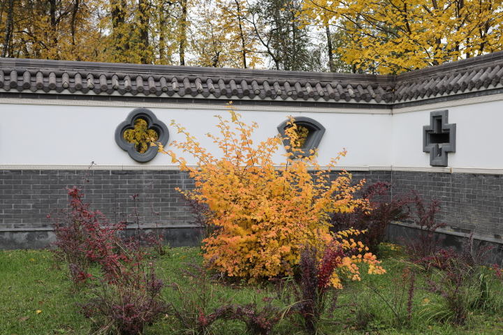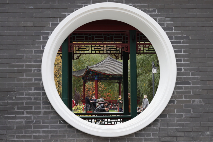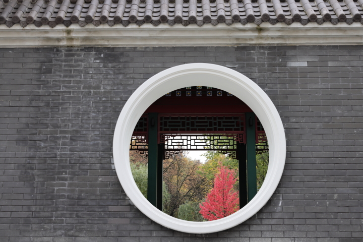 Сквозь круглые окна в кирпичной стене, частично окружающей парк, видны типичные китайские архитектурные элементы – скат крыши в беседке, резные орнаменты переходов. Кстати, орнамент, который можно разглядеть на фотографии выше, называется «шаг за шагом», он часто встречается в Пекине и символизирует стремление шаг за шагом идти к успеху.