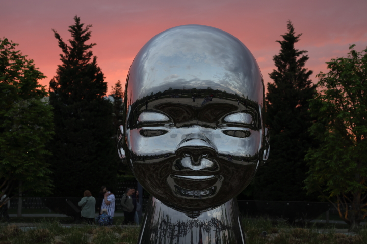 Инсталляция Кена Келлехера «Внутренний ребёнок» в закатном свете выглядит зловеще, в огромных блестящих младенцах, как в инопланетных объектах безучастно отражается погружающийся во тьму парк.