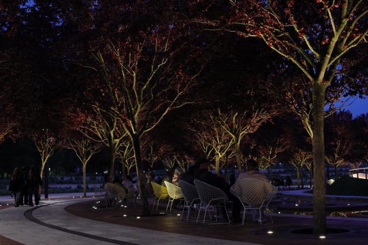 Ночью в парке так же много гуляющих, как и днём, меняется контингент – мамы с колясками пропадают, появляется больше пар и молодёжных компаний. Эффектная подсветка рисует новые картины сада.