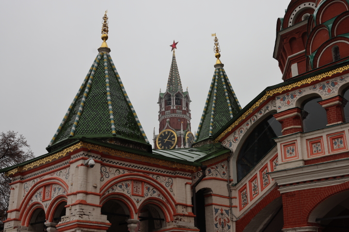 Всегда интересно побродить вокруг собора Василия Блаженного, всегда подмечаешь новые детали. Разноцветный, радостный, он создаёт атмосферу праздника в любой, даже самый ненастный день. Удивительно, что раньше он был двухцветным – краснокирпичным с белокаменными орнаментами, а главки были однотонными.